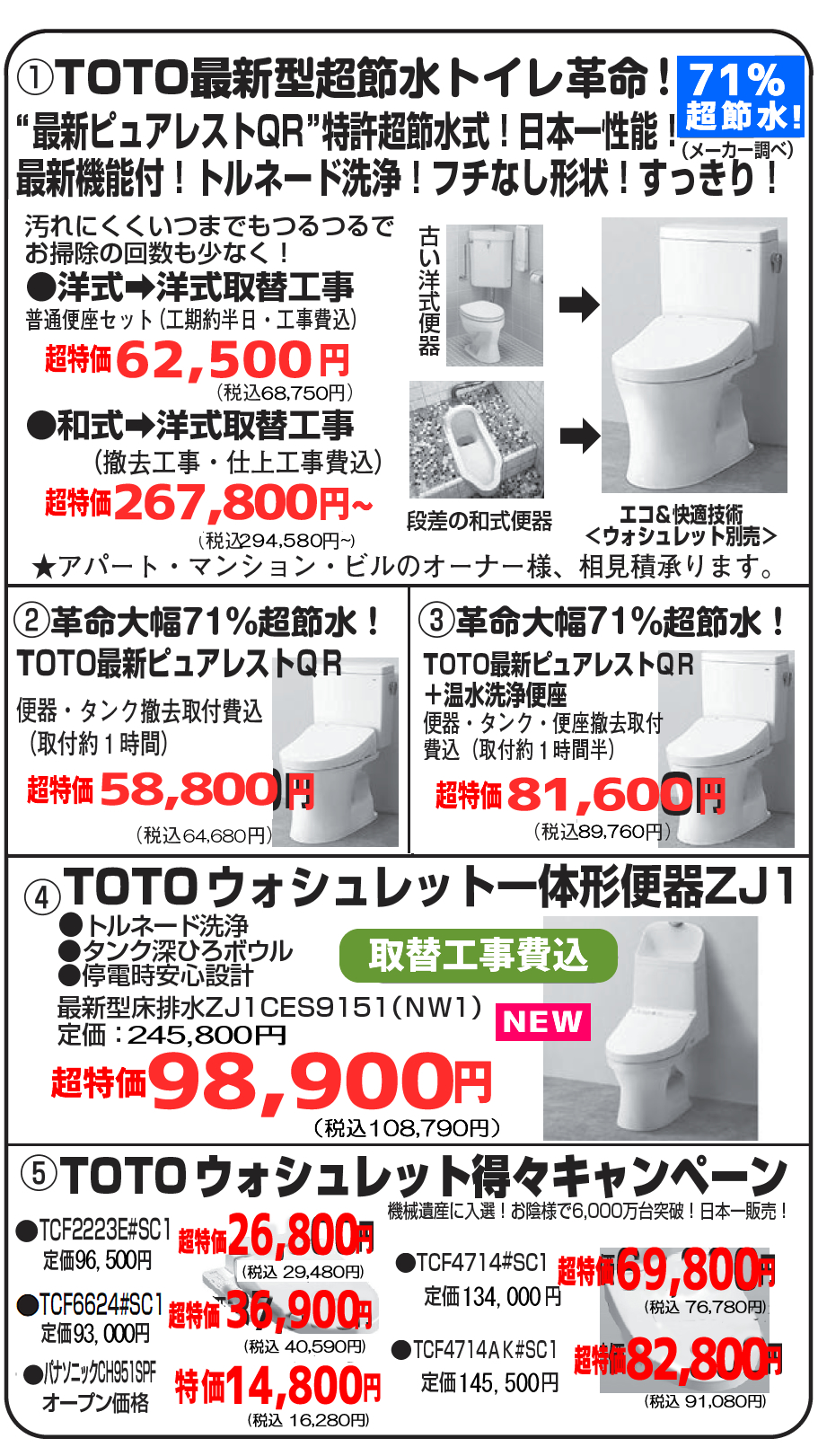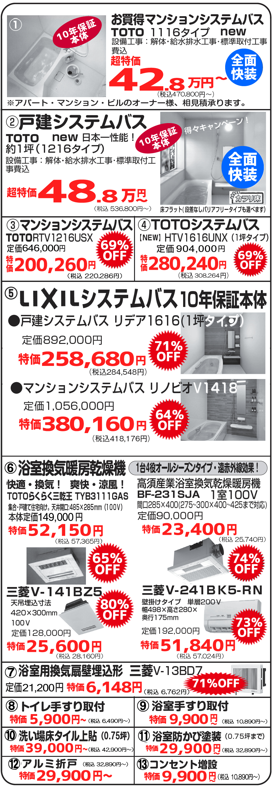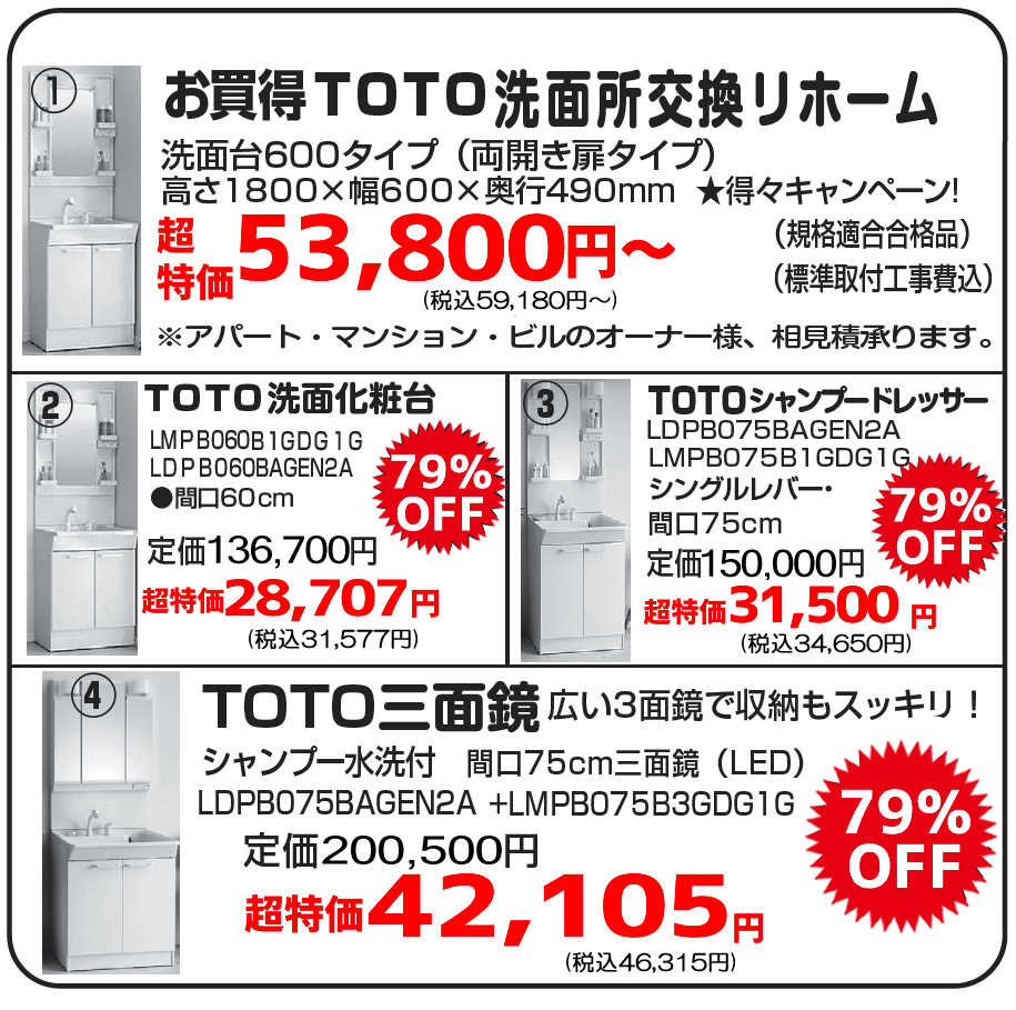・・・浴室・洗面所改修工事、トイレ改修工事、台所改修工事、内装工事